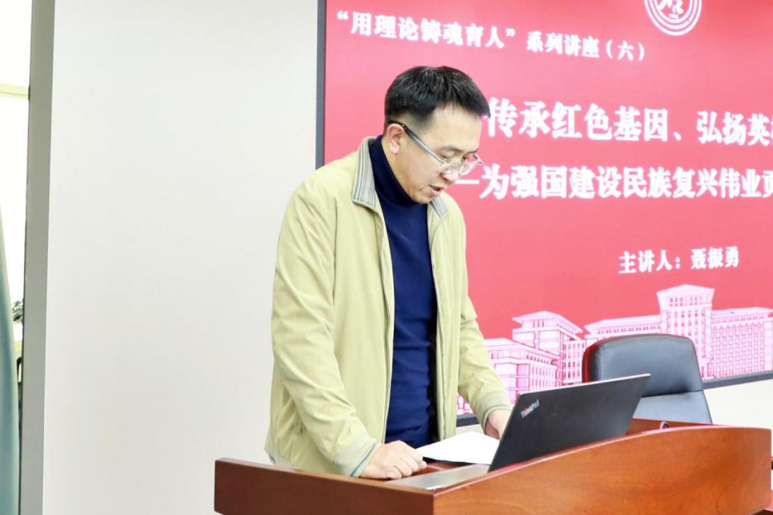 10月23日,系列讲座第六讲在中心校区东荣大厦904会议室举办。本次活动邀请鞍钢集团党委宣传部(企业文化部、统战部)部长、高级政工师聂振勇老师以“传承红色基因,弘扬英模精神——为强国建设民族复兴伟业贡献青春力量”为题向学院师生进行专题授课。学院领导班子、两委委员及各系师生党员共同参加本次讲座,讲座由学院党委副书记兼副院长朱大卫主持。