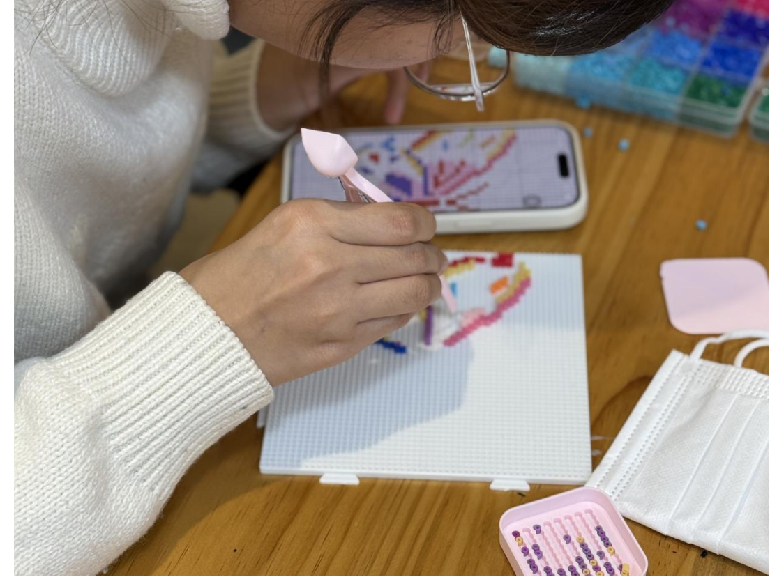 接下来,同学们纷纷投入到拼豆的制作中,大家先在网络上寻找了自己喜欢的样式,随后便拿起工具,沉浸在制作拼豆的乐趣之中。图案成型后,大家拿着熨斗小心烫熨,一个个独一无二的拼豆作品就此诞生。
