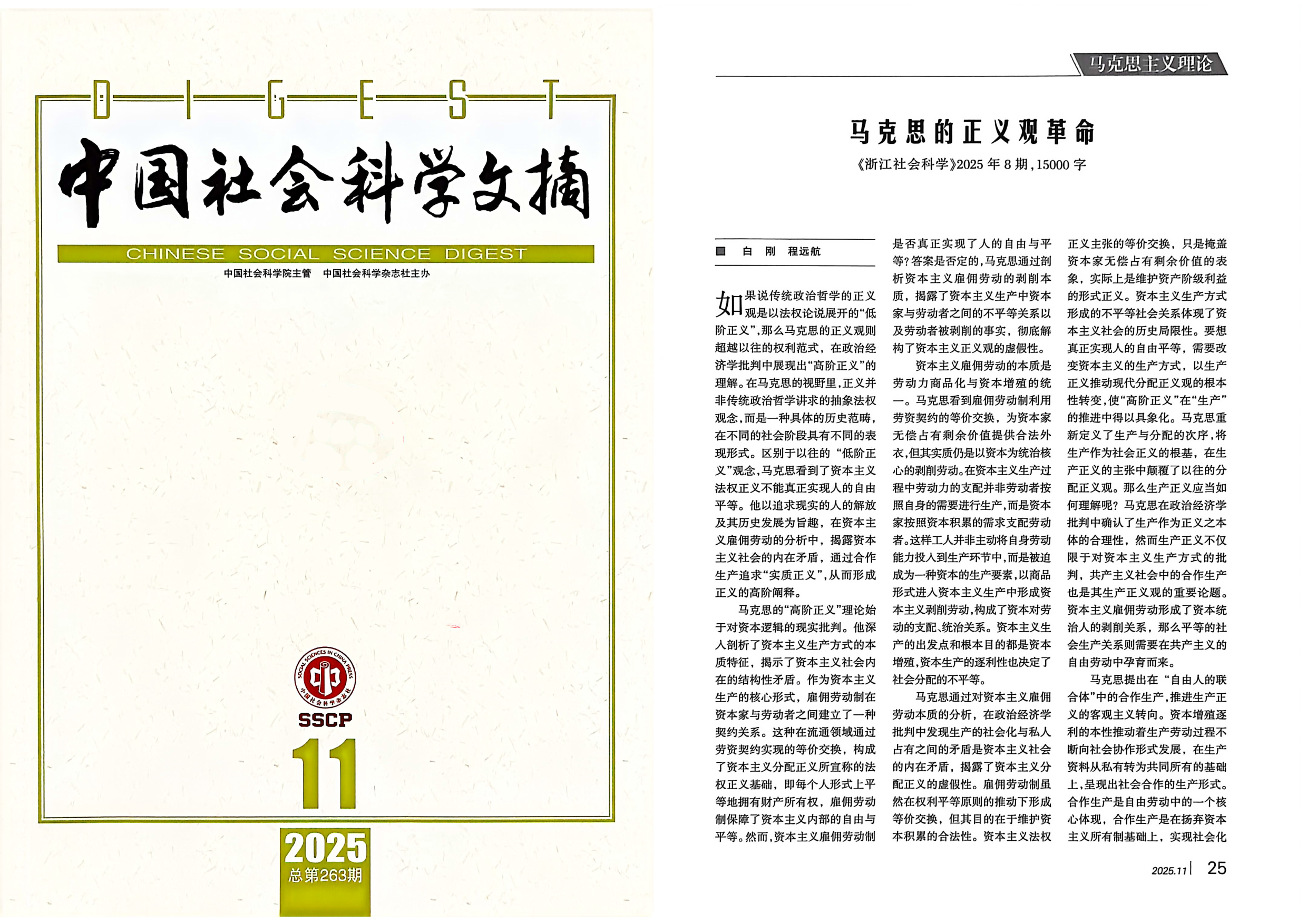 期的论文《从“低阶正义”到“高阶正义”:马克思的正义观革命》被《中国社会科学文摘》