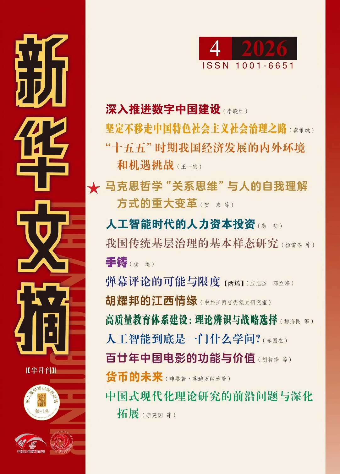 贺来教授论文被《新华文摘》2026年第4期全文转载