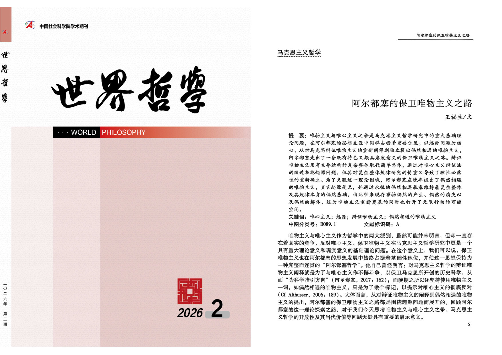 摘 要:唯物主义与唯心主义之争是马克思主义哲学研究中的重大基础理论问题,在阿尔都塞的思想生涯中同样占据着重要位置。以起源问题为核心,从对马克思辩证唯物主义的重新阐释到独立提出偶然相遇的唯物主义,阿尔都塞走出了一条既有特色又颇具启发意义的保卫唯物主义之路。辩证唯物主义用有主导结构的复杂整体取代简单总体,通过对唯心主义辩证法的改造拒绝起源问题,但其对复杂整体规律研究的倚重又导致了理性必然性的重新确立。为了克服这一理论困境,阿尔都塞在晚年提出了偶然相遇的唯物主义,直言起源是无,并通过永恒的偶然相遇暴露维持着复杂整体及其规律本身的偶然基础,由此带来现存事物偶然的产生、偶然的消失以及偶然的解体,这为唯物主义重新奠基的同时也打开了无限行动的可能空间。